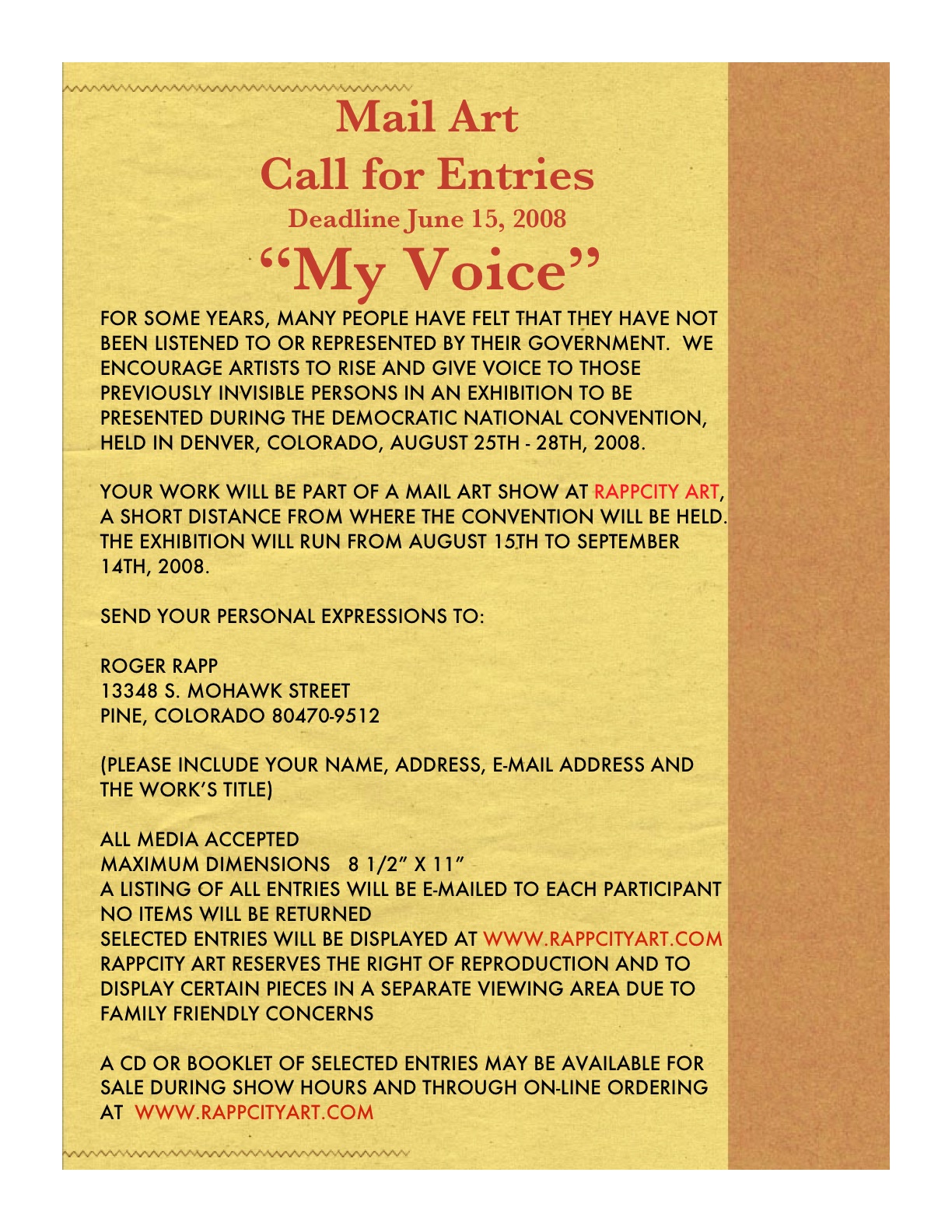 Tagged call for entries, Democratic National Convention, Denver, mail art, Roger Rapp